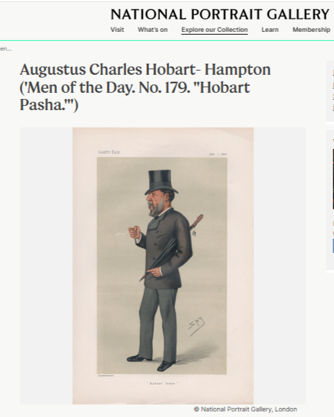 Fascinated by what I had seen on the walls of that room in Polesden Lacey, I then found that the original caricature of Hobart Pasha, a print of which I knew so well from my childhood, is in fact held in the National Portrait Gallery in London, number 179 in a series entitled "Men of the Day", showing that he really was among the top people of his time. What a privilege to live with such history.